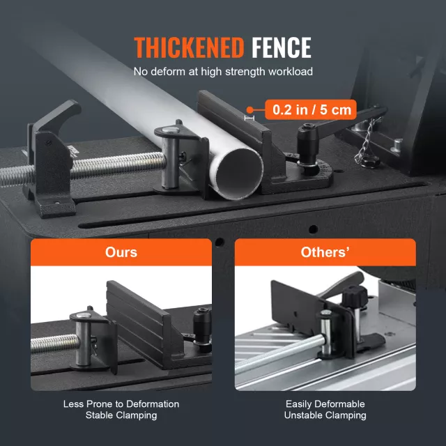 What makes this chop saw special is its thoughtful engineering. The reinforced heavy-duty base keeps the machine steady, reducing wobble for precision cuts every time. A thick, wave-pattern vise offers stronger clamping force, keeping materials secure as you work. The tool-less adjustable fence allows quick angle changes from 0° to 45°, making it ideal for jobs that require multiple cut types—without wrestling heavy material or searching for a wrench.