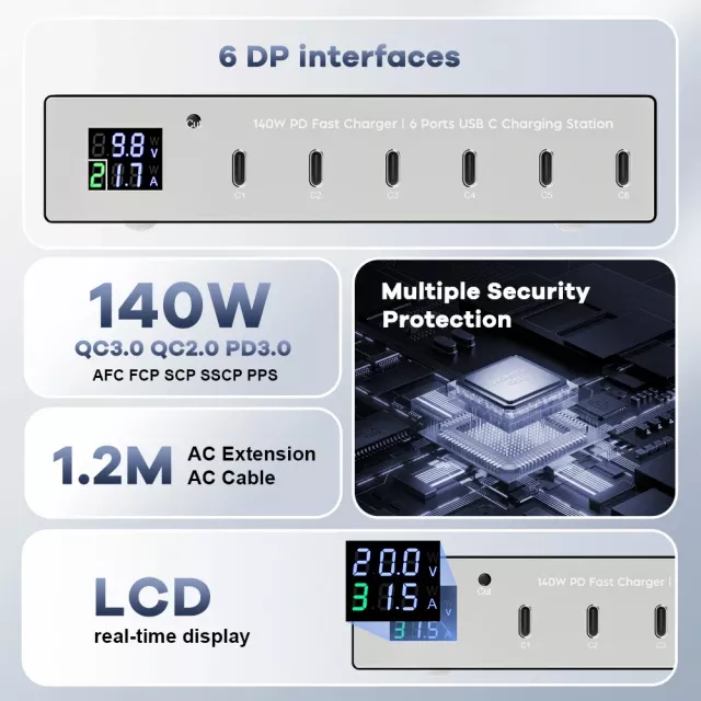 This charging station is engineered with advanced fast-charging technology to handle modern devices effortlessly. All six USB-C ports support PD3.0, QC3.0, and PPS protocols, delivering up to 30W per port while sharing a total output of 140W.