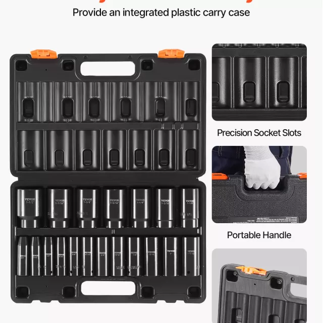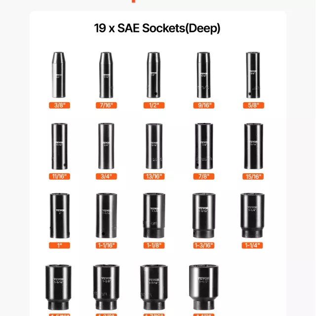 • 19 essential deep sockets from 3/8″ to 1-1/2″ for versatile use