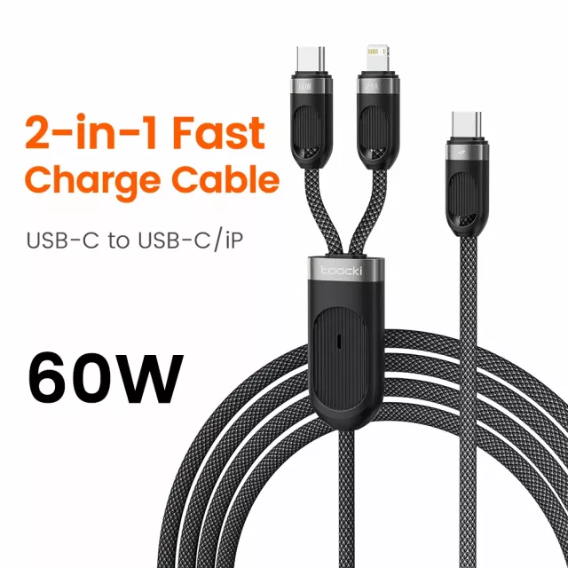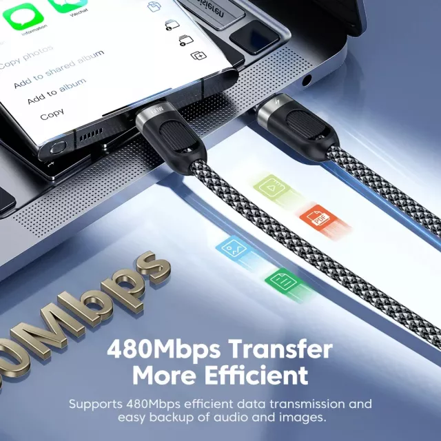 This cable supports fast charging for both USB-C and Lightning devices. The USB-C side delivers up to 60W power output for compatible smartphones and tablets, while the Lightning connector provides up to 2.4A flash charging for iPhones and iPads. It also allows data transfer at speeds up to 480Mbps on USB-C, making file transfers quick and smooth.