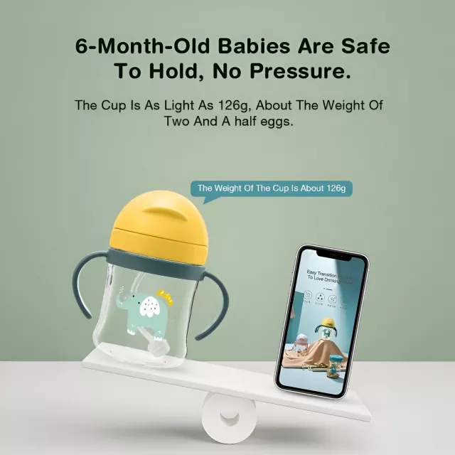 This cup combines smart design with baby-friendly comfort. It features a soft straw with a gravity ball that lets children sip from any angle, helping them drink naturally without tilting. The leak-proof lid keeps water secure even when the cup is shaken or dropped, while the dust cover protects the straw to keep it clean between uses. Comfortable handles with grip points make it easy for small hands to hold, helping little ones practice independence while staying safe.