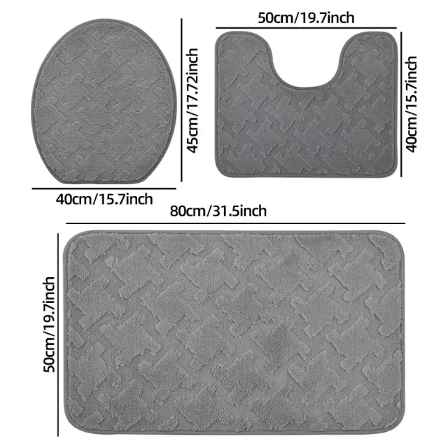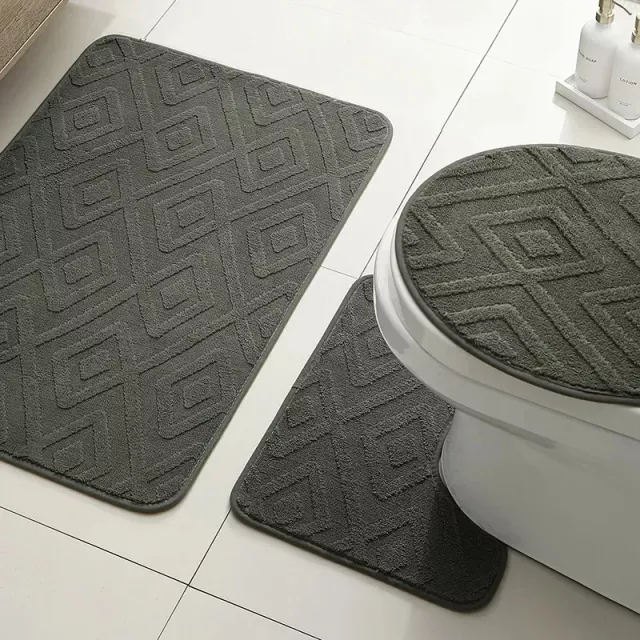 • 3-piece set: rectangular floor mat, U-shaped toilet mat, and toilet lid cover