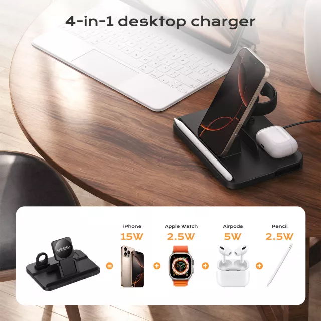 Tired of messy cables and scattered chargers? This 4-in-1 magnetic wireless charging stand keeps your iPhone, Apple Watch, and wireless earbuds powered up in one clean, organized spot. It delivers fast, stable wireless charging up to 15W while acting as a sleek display stand for your phone. Perfect for your desk, nightstand, or kitchen counter, it makes charging feel effortless and modern.