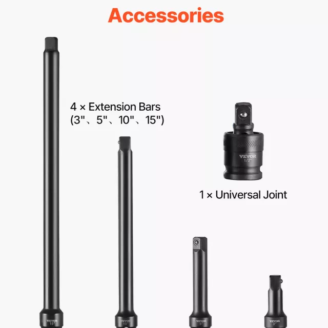 This impact socket set stands out for its high torque performance, wide compatibility, and professional-grade construction. Use it any time you need reliable fastening power: auto repair, equipment assembly, industrial maintenance, power system inspections, and more. With both deep and shallow sockets, four extension bars, and a universal joint, you’ll always have the right tool for tight spaces, stubborn bolts, or high-impact tasks.