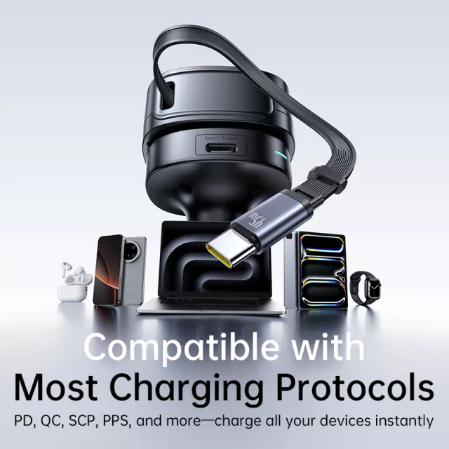 This charger delivers a total output of up to 60W, allowing you to power a laptop, phone, and accessories all at once. It includes one built-in fast-charging Type-C cable, one additional Type-C port, and one USB-A port. The head rotates 180° so you can direct the charger toward the front or back seats for easy access. The retractable cable stretches up to about 31 inches for flexible use, then smoothly winds back in for a clean, tidy setup.