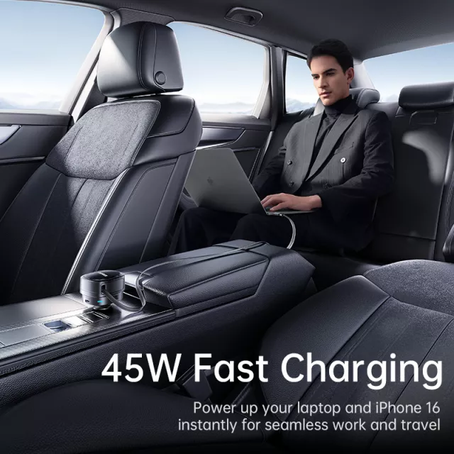 Extend with ease. Charge in seconds. This high-performance car charger is built for modern drivers who rely on multiple devices on the road. With three charging ports and a smart retractable cable, it lets everyone in the car stay powered — from the front seat to the back row — without cord clutter or power competition.