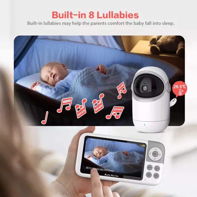 This baby monitor offers a full set of practical features that make parenting easier. The camera rotates up to 300° horizontally and 50° vertically, letting you see every corner of the nursery. With 3X digital zoom, you can check on your little one up close and capture every detail. Automatic night vision ensures clear images in complete darkness, while built-in lullabies help soothe your baby into peaceful sleep. A temperature sensor keeps you informed about the room’s climate, ensuring your baby stays comfortable all day long.