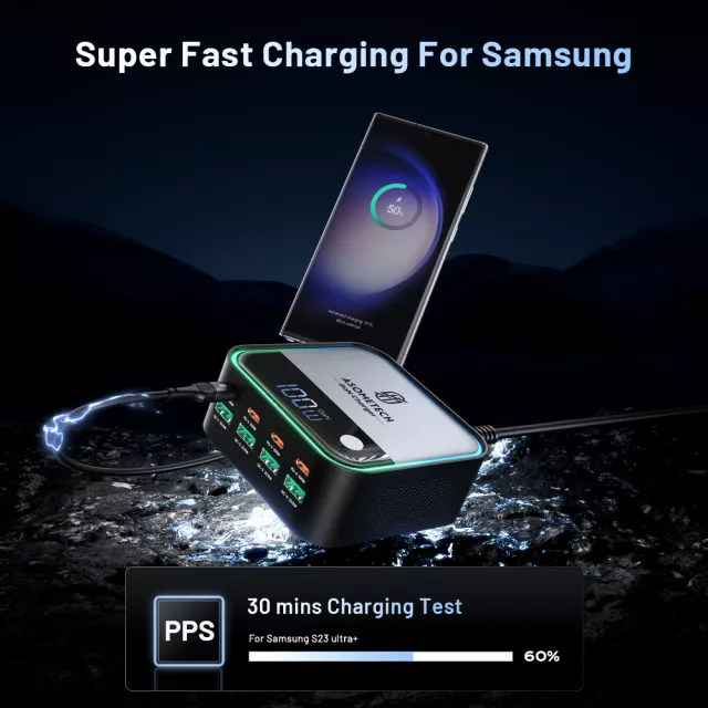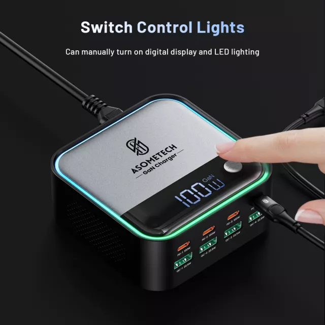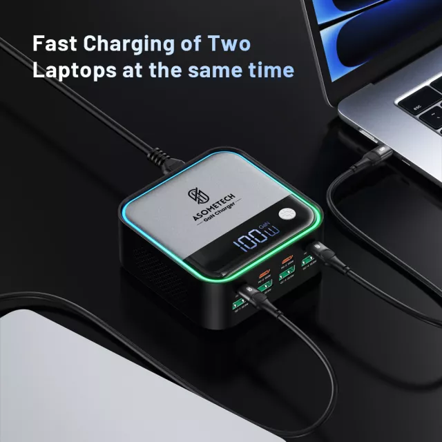 Unlike ordinary chargers, this one uses advanced GaN technology to deliver high power in a smaller, cooler, and more energy-efficient design. It features 4 USB-A ports and 4 USB-C ports, giving you full flexibility for modern and older devices. The built-in LED display shows real-time charging information, so you always know how your power is being distributed.