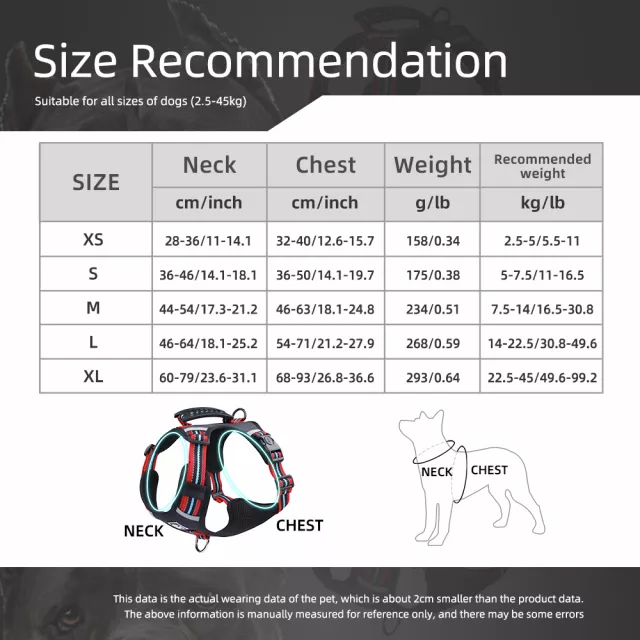 Not sure which size to choose? Measure your dog’s chest and neck, keeping in mind that manual measurements may vary by about 0.4–0.8 inches. If you’re between sizes or unsure, choose the slightly larger option.