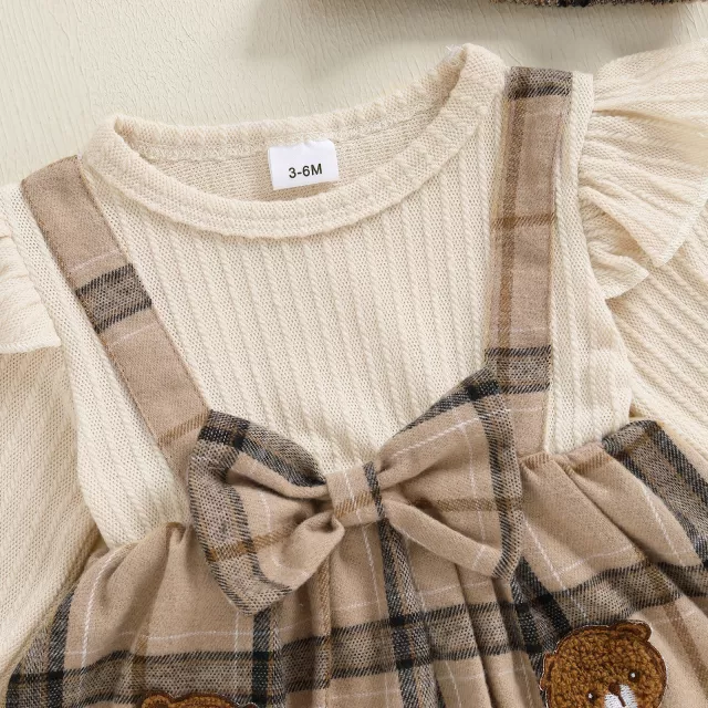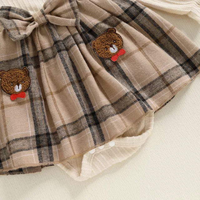 Dress your precious baby girl in timeless elegance with this delightful plaid romper dress featuring a sweet embroidered bear design. Made with soft, breathable fabric that combines 95% polyester and 5% elastane, this outfit keeps your baby cozy, comfortable, and free to move all day long. The classic plaid pattern and ruffled bubble sleeves bring a touch of vintage charm, while the included matching headband completes the picture-perfect look. Perfect for everyday wear, photoshoots, and special occasions, this romper dress makes every moment extra adorable.