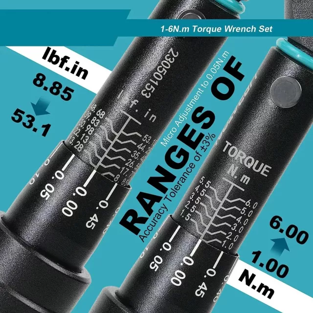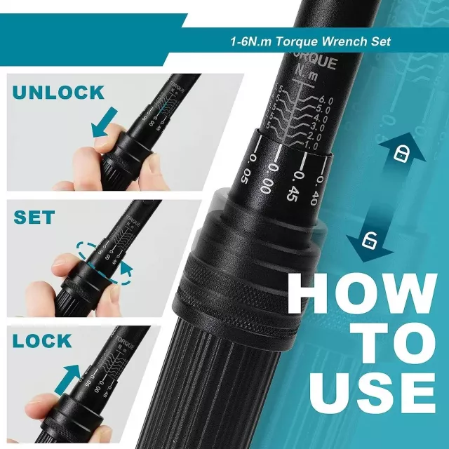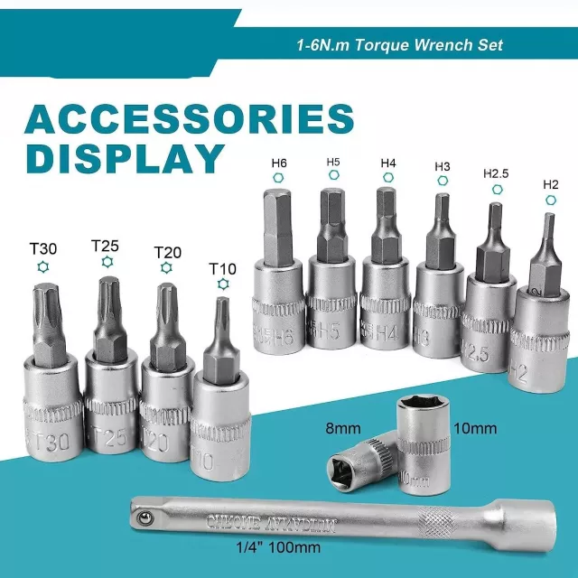 This complete kit includes everything needed for confident repairs and upgrades. The wrench features a durable alloy-steel head and a comfortable non-slip handle for better grip and stability. The clear Nm scale makes it easy to set your exact torque, and the distinct click lets you know the pre-set torque has been reached. With its wide selection of hex and Torx bits, extension bar, and sockets, you’ll be ready for almost any adjustment at home or on the go.