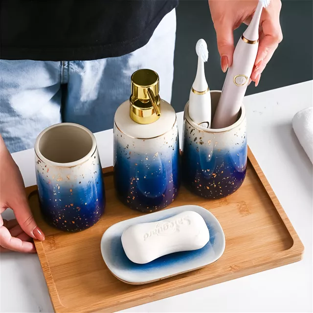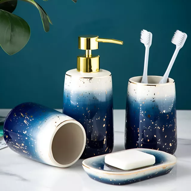 Bring charm and elegance to your bathroom with this Blue Starry Sky Ceramic Bathroom Accessory Set. Designed with a rich deep-blue finish and a soft gold-sprayed pattern, this four-piece set adds a touch of luxury to any space. Each item is crafted from high-quality ceramic, offering durability, smooth texture, and a premium feel. Whether you’re refreshing your master bathroom or elevating your guest washroom, this set instantly transforms the space into a serene, spa-like retreat.