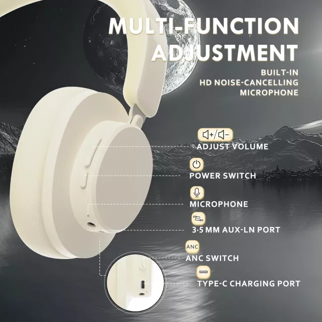 With its lightweight 7.4oz build and soft, breathable memory-foam ear cushions, this headset stays comfortable even during long listening sessions. The adjustable over-ear fit reduces pressure so you can enjoy your audio without distraction. A convenient multi-function button lets you manage calls, adjust volume, and activate ANC with ease, while the foldable design makes it simple to store and carry wherever you go.