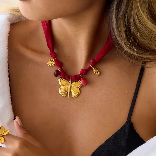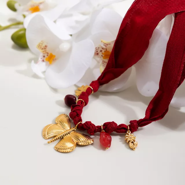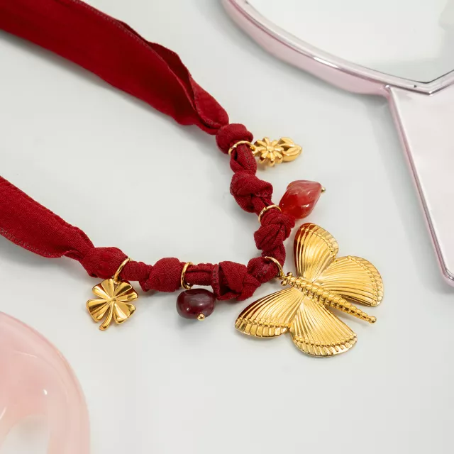 Turn any outfit into a statement with this stunning Butterfly Clover Natural Stone Pendant Necklace. Designed to capture attention, it blends the soft charm of a red-patterned cotton headscarf with the luxurious gleam of 18K gold-plated stainless steel. This beautiful piece offers the perfect mix of natural texture and timeless shine, giving your look an effortless touch of elegance.