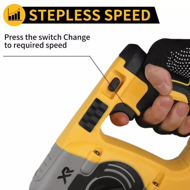 This tool features a no-load speed of up to 1100rpm and a hammer frequency reaching 4600bpm, giving you the force you need for rapid, clean drilling. With an SDS-Plus four-pit chuck, bit changes are quick and secure. A fully rotatable 360° auxiliary handle provides stability from any angle, while stepless speed control and a forward/reverse switch give you precise command in every situation.