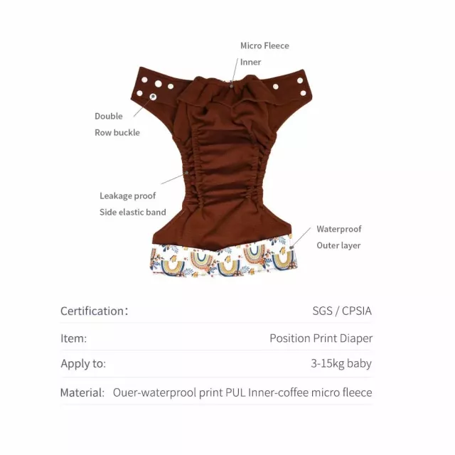 This reusable diaper is thoughtfully made to provide dryness, softness, and excellent leak protection. The coffee fleece inner material helps wick moisture away quickly, keeping your baby comfortable during naps, playtime, and overnight use. The breathable outer layer adds extra protection while maintaining airflow, preventing discomfort from heat or dampness. Double gussets serve as powerful leak guards, giving parents peace of mind whether at home or on the go.