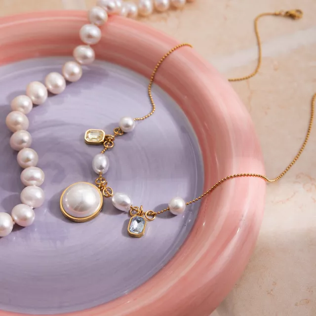 • Pendant: A round imitation pearl elegantly framed by a square zircon, offering a charming yet sophisticated design.