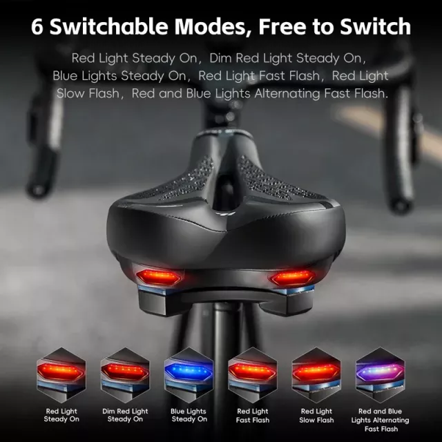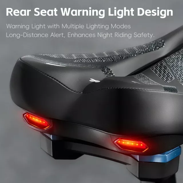 This upgraded saddle is packed with features that elevate every cycling experience. Its hollow breathable structure keeps airflow moving to reduce heat buildup and discomfort, making it ideal for long-distance rides and intense sessions. The shock-absorbing design helps cushion bumps and vibrations, giving you a smoother ride even on uneven ground. With an integrated taillight offering six lighting modes, you stay highly visible during night rides or early-morning commutes.