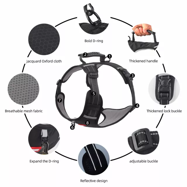 This harness is packed with thoughtful details that make life easier for both you and your dog. Its anti-choking structure keeps pressure off the neck, while the sturdy PVC handle gives you quick control when crossing roads or guiding your pet. The D-ring allows easy leash attachment, and the insert buckle ensures a secure fit. With reflective accents, your dog stays visible during evening or early-morning outings.
