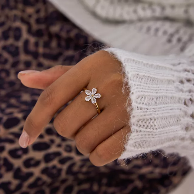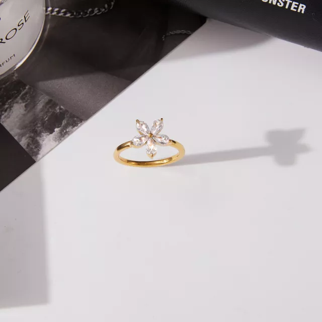 Step into the spotlight with this stunning five-petal flower ring, designed to bring a touch of brilliance to your everyday style. Crafted from high-quality stainless steel and enhanced with radiant white cubic zirconia, this ring delivers a shimmering floral design that instantly catches the eye. Its smooth, rust-proof finish ensures long-lasting shine, while the 18k gold plating adds a warm, luxurious glow. Whether you’re dressing up for a festive party or adding charm to a casual outfit, this trendy piece acts as the perfect accessory.