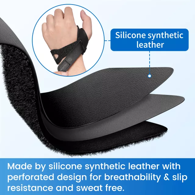 This thumb brace is crafted from durable NBR rubber that stays flexible while resisting tears, cracks, and deformation. Its soft, elastic feel minimizes friction between the thumb and index finger, ensuring all-day comfort. The full palmar bar made from sturdy TPU plastic helps prevent CMC hyperextension for enhanced joint protection. A smooth silicone leather wrist strap adds a stable, non-slip hold, while a reinforced metal insert wraps securely around the base of the thumb to deliver dependable support without restricting natural hand movement.