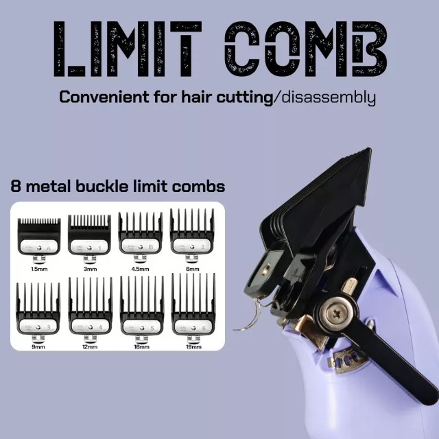 This clipper comes equipped with a long-lasting 4500mAh lithium battery that offers up to 240 minutes of uninterrupted use after a full charge, making it ideal for extended grooming sessions. The convenient charging base keeps it ready whenever you need it. An LED circular indicator displays power status clearly, while the lightweight ABS body ensures comfortable handling. With multiple guide combs ranging from 0.06 in to 0.75 in, you can easily switch between lengths for customized styling.