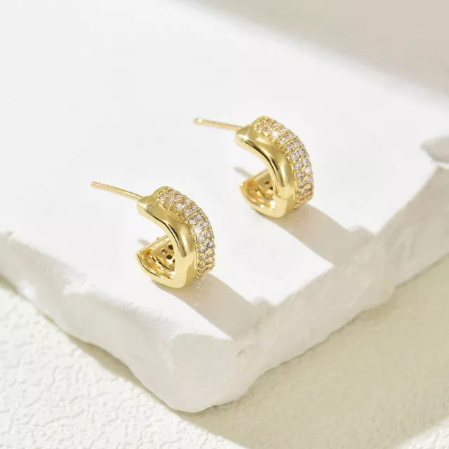 Crafted from quality copper and adorned with sparkling zircon, these earrings offer durability and long-lasting shine. Their lightweight design ensures comfortable wear throughout the entire day, while the secure push-back closure keeps them firmly in place. Measuring just under an inch, they provide the perfect balance of subtlety and statement, making them suitable for women of all ages who appreciate fashionable yet timeless accessories.