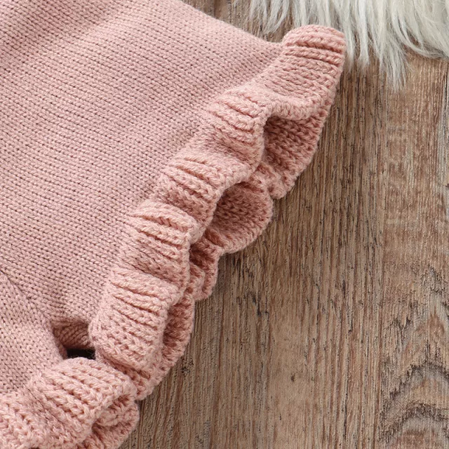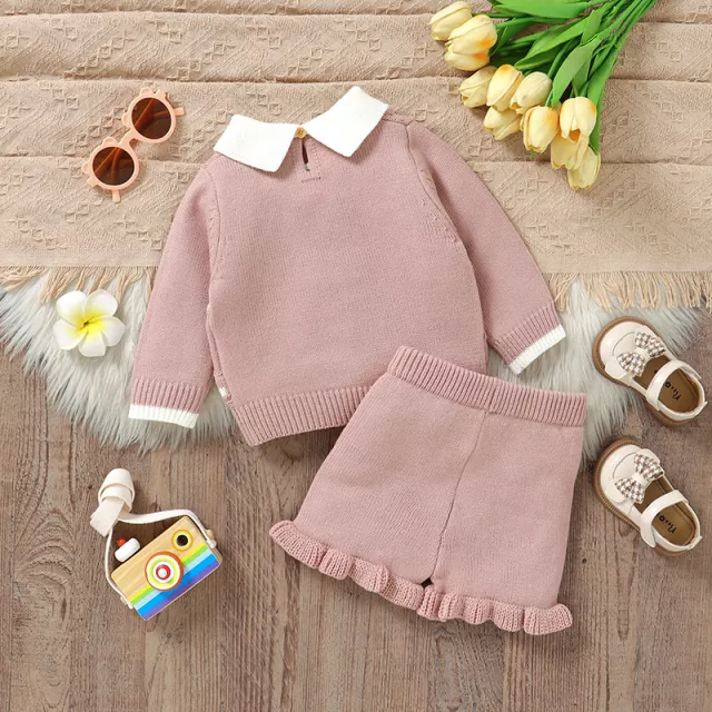 Wrap your little one in pure comfort and cuteness with this Knitted Baby Girl Sweater & Shorts Set. Designed to keep your baby cozy while looking absolutely charming, this two-piece outfit includes a soft long-sleeve pullover sweater with a stylish turn-down collar and matching knit shorts. The lovely pink hue and delicate ruffle details make it a timeless outfit for your little girl’s wardrobe.