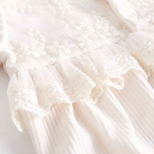 This romper blends practicality with beauty, making it both functional and delightful to wear. Its vintage-inspired corduroy texture offers warmth without heaviness, while the lace floral touches create a standout style that feels both sweet and sophisticated.