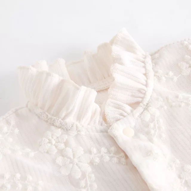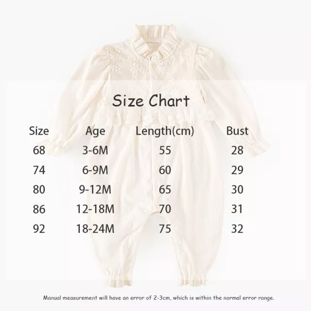 The romper includes lovely lace floral embellishments on the chest, paired with lace-trimmed edges that highlight its feminine, timeless charm. Ruffled details at the collar, cuffs, and leg openings add extra cuteness. For busy parents, the covered snap buttons down the front and between the legs make dressing and diaper changes quick and easy. Sized to fit babies from 3 to 24 months, it comfortably supports little ones ranging from 21 to 27 inches in length. The fabric is soft, smooth, and gentle on delicate skin, ensuring your child feels great during every wear.
