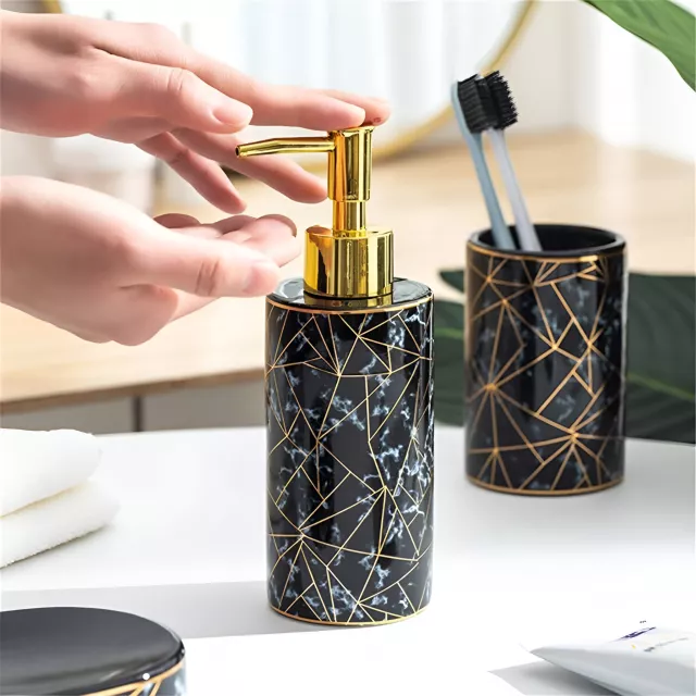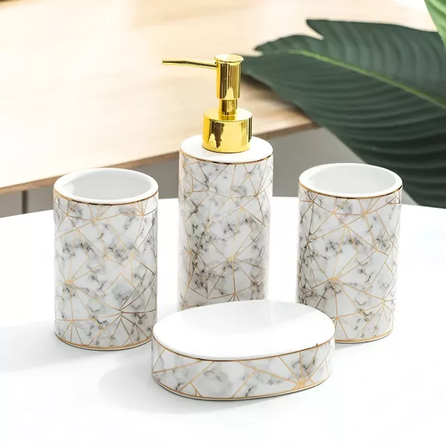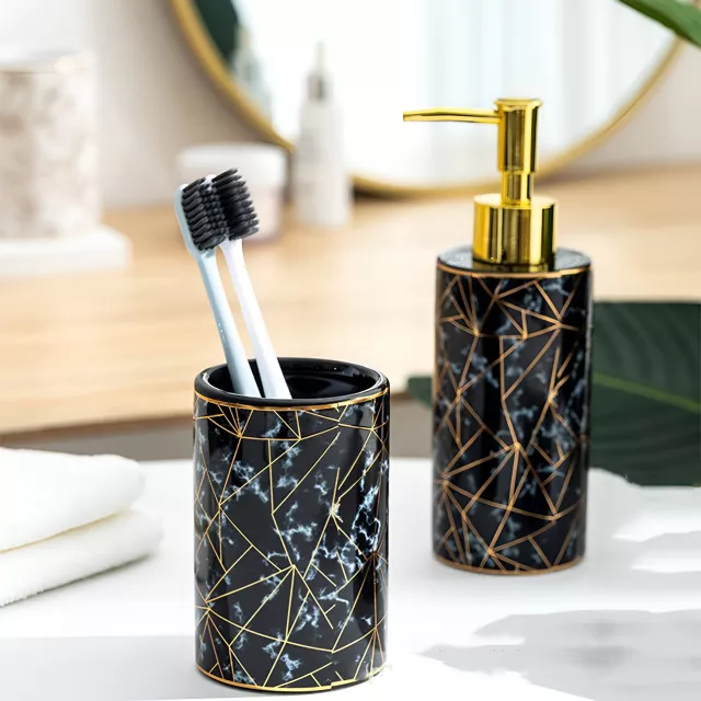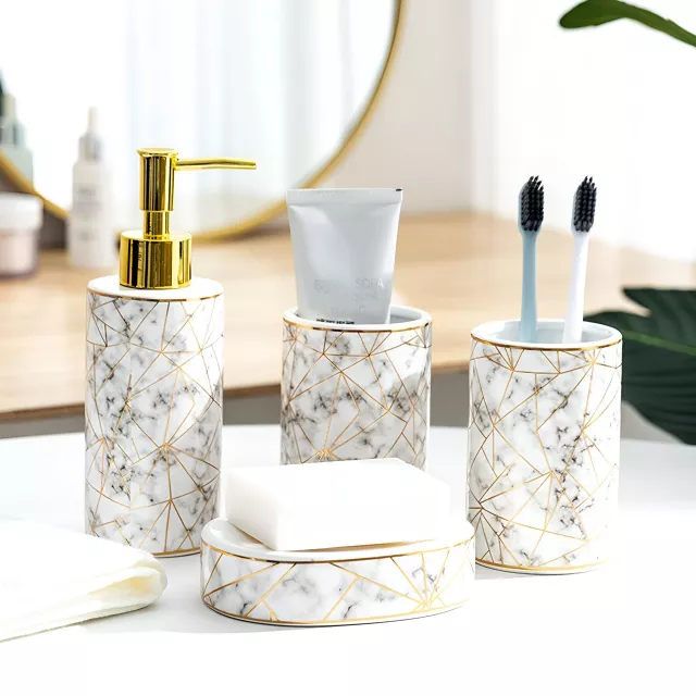 Refresh your bathroom with a set that blends style, quality, and convenience. Add this elegant marble ceramic collection to your space and enjoy a cleaner, more polished bathroom experience. Upgrade your countertop today and feel the difference every time you step into your bathroom.
