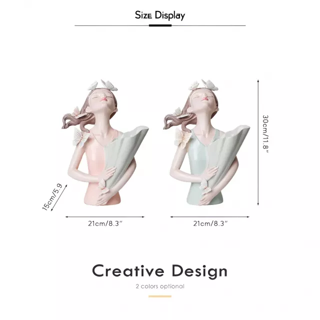 Transform your living space with the enchanting charm of the Mint Green Butterfly Girl Vase. This captivating tabletop sculpture combines art, elegance, and functionality in one stunning piece. Crafted from high-quality resin, it features a serene girl’s bust delicately adorned with butterflies, exuding a modern yet pastoral aesthetic. The mint green finish adds a soothing and refreshing touch, perfect for brightening any room with a hint of artistic sophistication.