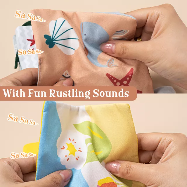 This educational cloth book is filled with cute animal illustrations, crinkle pages, and engaging textures that encourage sensory play. Its soft fabric construction makes it safe for curious babies who love to grab, squeeze, and explore. The pages measure conveniently for small hands, with each panel offering bright, simple artwork to keep your child’s attention.
