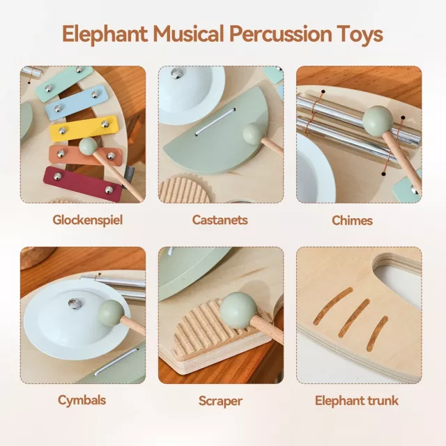 Introduce your little one to the joyful world of sound with this enchanting Montessori-inspired wooden music table. Designed as a friendly elephant, it brings together a colorful xylophone, a soft-tone drum, and playful rod bells—inviting babies and young children to explore rhythm, melody, and movement. Crafted from smooth, kid-safe wood, this music set is made for tiny hands and curious minds.