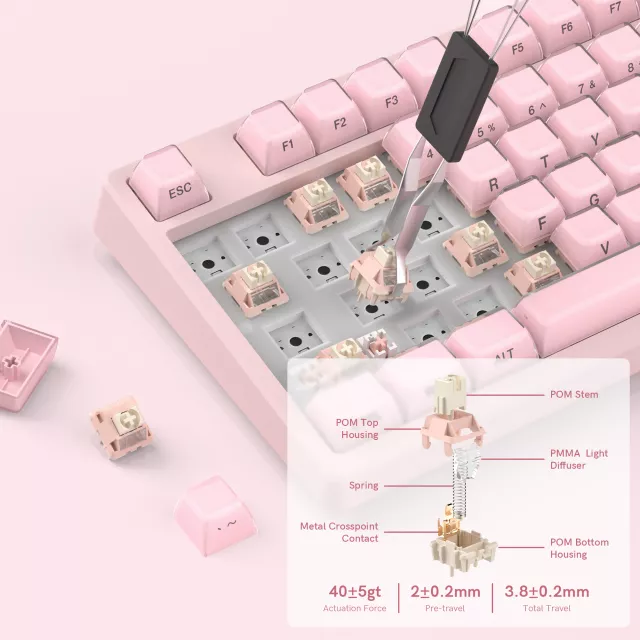 The keyboard’s gasket-mounted build, EVA positioning plate, and internal dampening deliver a soft, cushioned keystroke with a satisfyingly smooth feel. Pre-lubed linear cream switches offer fast response and long-lasting durability, and you can easily hot-swap any 3-pin or 5-pin mechanical switch to match your typing preferences.