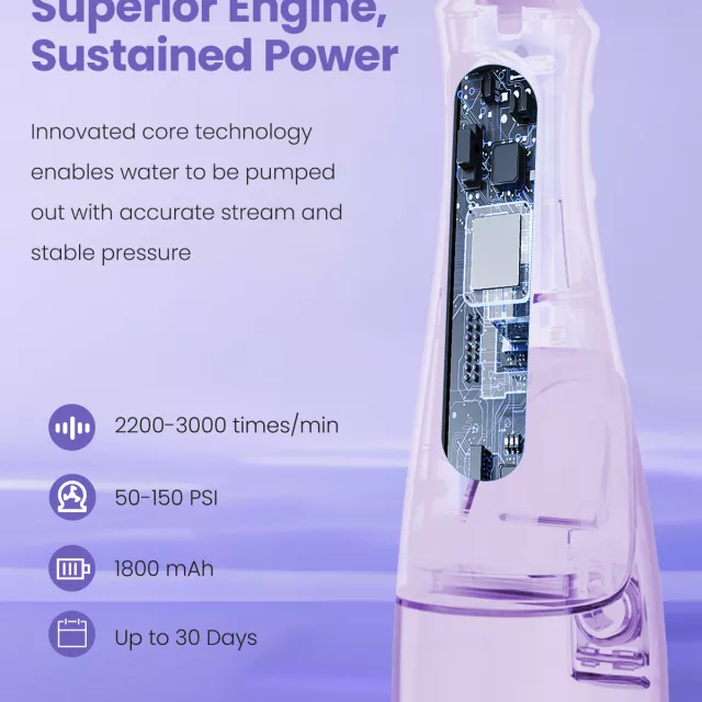 This cordless oral irrigator is built for comfort, simplicity, and performance. Whether you’re new to water flossing or experienced, you’ll appreciate the ultra-quiet operation and intuitive controls. The long-lasting rechargeable battery lets you enjoy up to 30 days of use on a single charge, making it an ideal everyday hygiene tool and a perfect travel companion.