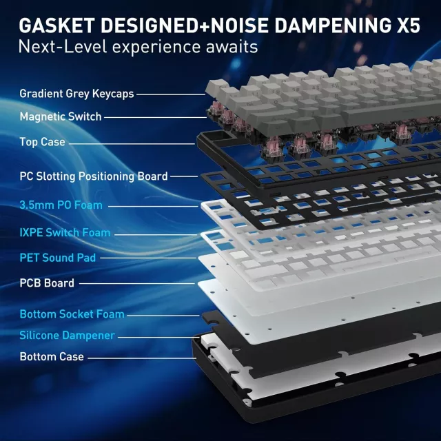 Triple-layer noise dampening—featuring EVA foam, socket foam, and a silicone base—creates a smooth, muted typing experience. Each keystroke feels solid, satisfying, and distraction-free. Combined with an 8,000 Hz polling rate and detachable USB-C connection, input reaches your game up to eight times faster for unmatched responsiveness.