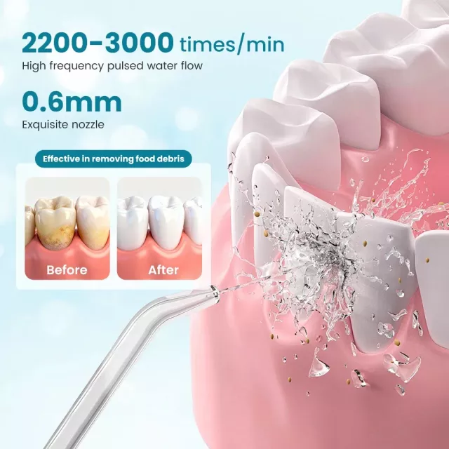 The oral rinser comes equipped with everything you need for a professional-level clean at home. It includes a 200–299 ml water tank, three interchangeable nozzles, and a powerful rechargeable battery. Using pulse-based water jet technology at up to 2000 impacts per minute, it efficiently targets hard-to-reach areas while staying gentle on enamel and gums. This device is best used daily—ideal for mornings, nights, and especially after meals.