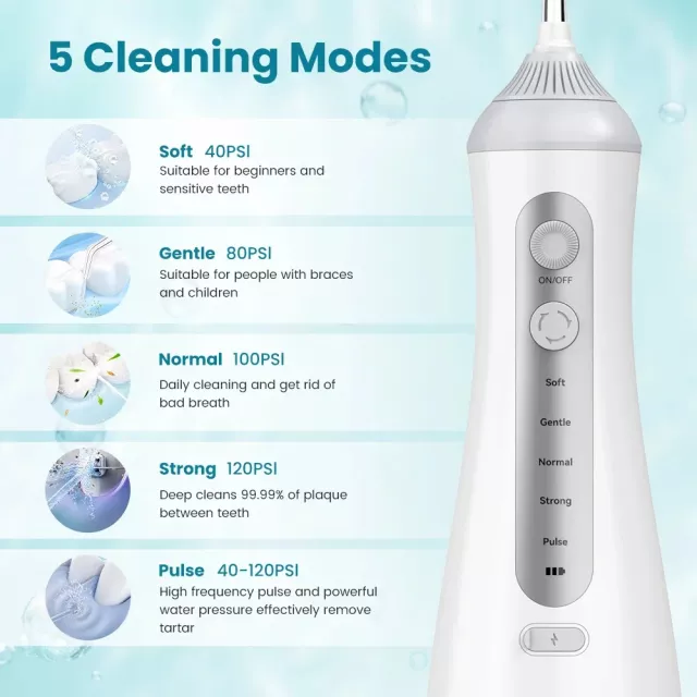 With 5 versatile cleaning modes, this water flosser adapts effortlessly to your needs. Whether you have sensitive teeth, require gentle gum care, or want a deep, invigorating clean, you can customize your water pressure for total comfort and confidence. Its built-in light bar clearly displays the pressure level, making it easy to find the perfect setting every time.