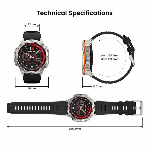 Beyond toughness and endurance, this smartwatch provides detailed monitoring with heart rate, blood oxygen, blood pressure, and sleep tracking features. Its waterproof build (up to 164 ft / 50 m) and shock-resistant construction ensure confidence in any condition. With a battery that lasts up to 10–15 days of daily use and up to 50 days on standby, it’s ready to keep up with nonstop lifestyles.
