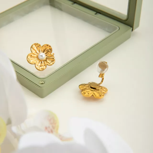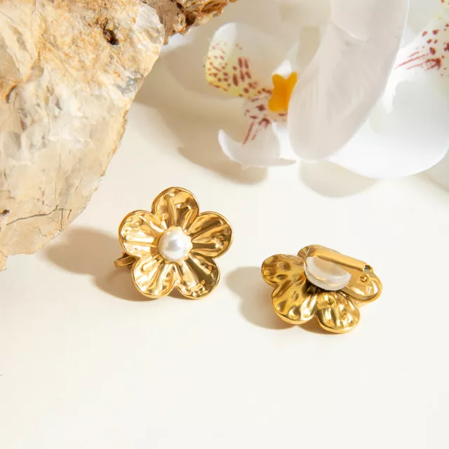 Discover timeless beauty with these Sweet Pearl Inlay Flower Clip-On Earrings, crafted to bring a soft, romantic glow to every look. These lovely earrings feature a delicate flower-shaped design accented with luminous faux pearls, making them a charming addition to your jewelry collection. Made from hypoallergenic stainless steel and finished with luxurious 18K gold plating, they offer both comfort and style for all-day wear.