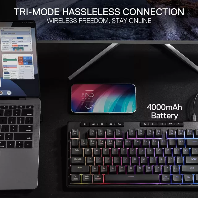 Whether you’re grinding ranked matches, exploring open worlds, or multitasking during long productivity sessions, this keyboard adapts instantly. Its advanced 3-mode connection lets you switch between USB-C wired, Bluetooth 3.0 or 5.0, and 2.4 GHz wireless with ease. Enjoy stable performance at home, at work, or on the go—no cables required.