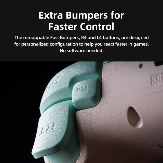 Extra rear R4 and L4 bumpers let you personalize your layout without needing any software, while wear-resistant metal joystick rings help keep your controller performing perfectly over time. A quick mode switch button also makes it easy to adjust settings as you jump between gaming platforms.