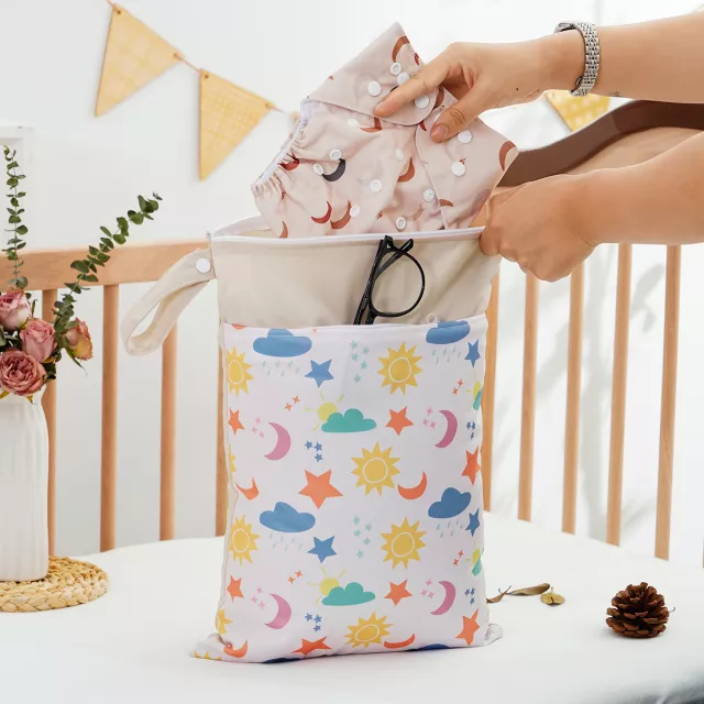 Sized between approximately 12 and 20 inches in length, this portable bag provides generous space without feeling bulky. Its unisex printed design pairs with a single-package style that’s easy to grab and carry. The waterproof interior safely holds diapers, wet clothes, swimsuits, or gym gear, while the dry side keeps fresh items neatly packed.