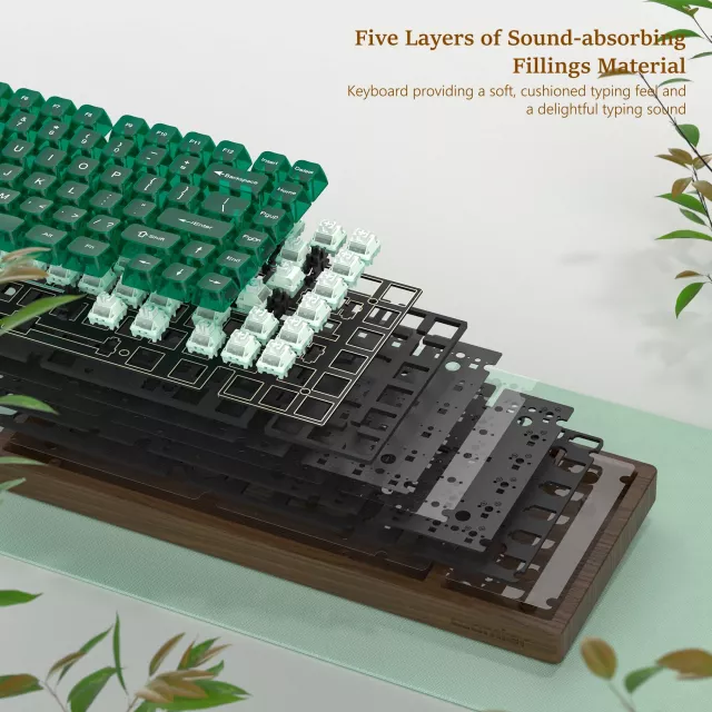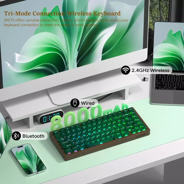 Experience a keyboard that blends the warmth of real walnut wood with the precision of advanced mechanical engineering. This wireless 75% mechanical keyboard is designed for both work and play, offering a smooth, comfortable feel and a striking look that elevates any setup. Its dark wood exterior feels refined to the touch, while translucent green keycaps create a unique balance of modern style and natural charm.