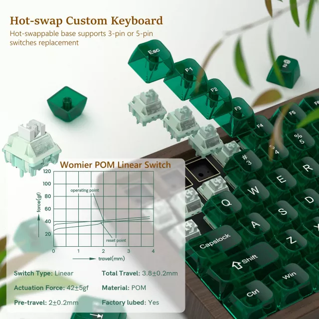 Enjoy a soft, cushioned typing experience thanks to five layers of sound-absorbing material. Pre-installed full POM linear switches deliver fast, smooth keystrokes ideal for both gaming and everyday productivity. With hot-swap capability, you can easily swap in any compatible 3-pin or 5-pin switch to tailor the feel to your preferences.
