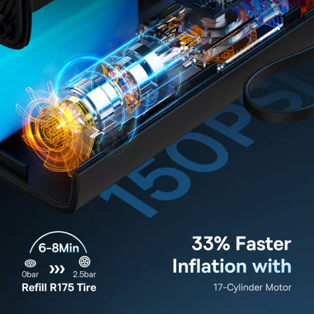 This air pump uses an advanced 17-cylinder copper motor that delivers up to 33% faster inflation than standard portable pumps. It can fully inflate a regular car tire (R175) in about 8 minutes, saving you time when you need it most. The high-precision digital display shows your tire pressure in real time, so you always know exactly what’s happening.